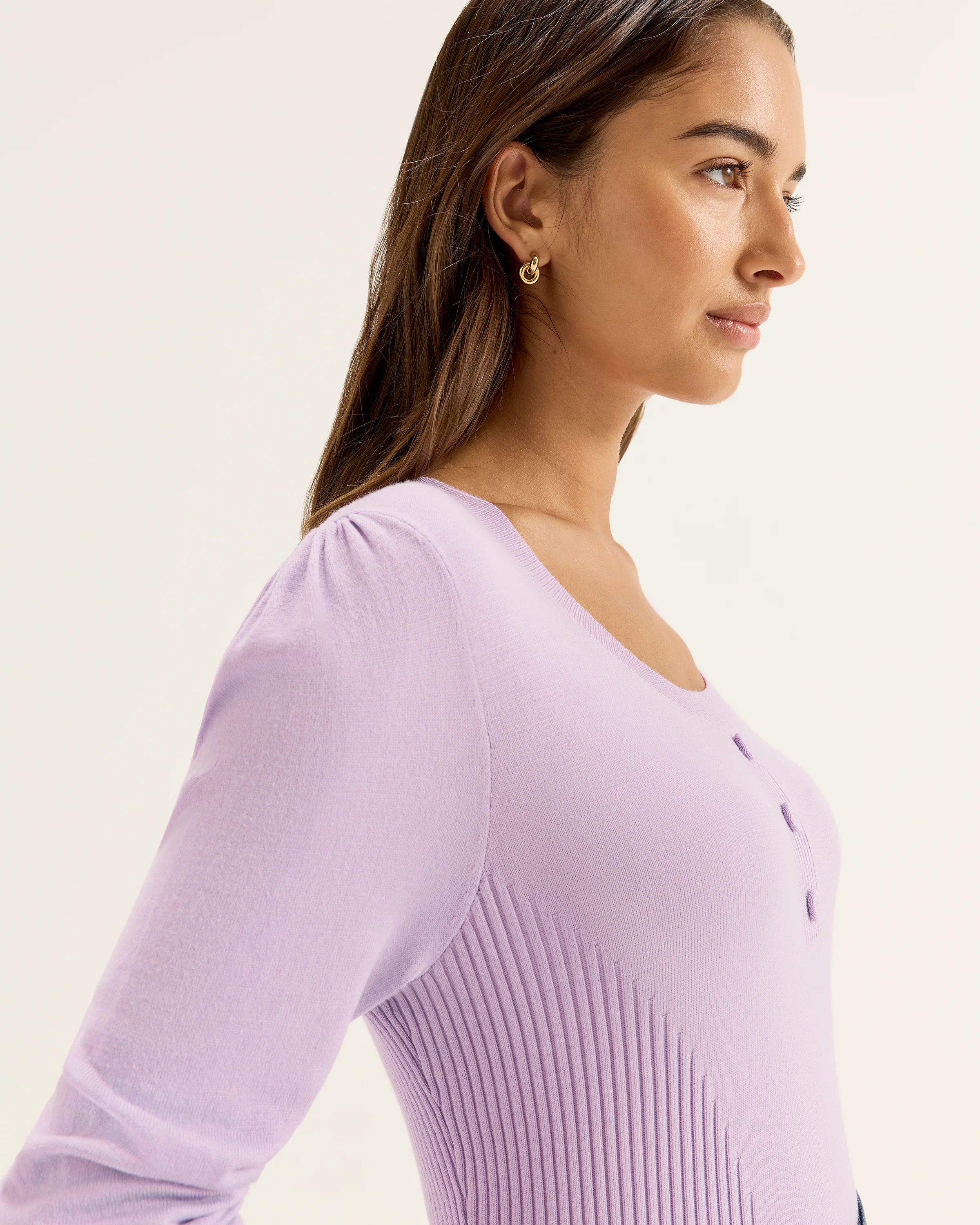 Refresh your knitwear for the season with our Becca Knit Top, a beautiful piece for transitioning through the seasons. Made of a soft and stretchy knit fabric, the Becca Knit Top is cut to a comfy fit with ribbed panelling in the sides that flatters the figure and shows off your silhouette. Accentuated by a round neckline with a mock button feature and full length sleeve with gather detailing at the shoulder, the Becca Knit Top is perfect for wearing with your favourite jeans, skirts, and tailored pants to add a soft, luxe touch to your day to day looks.