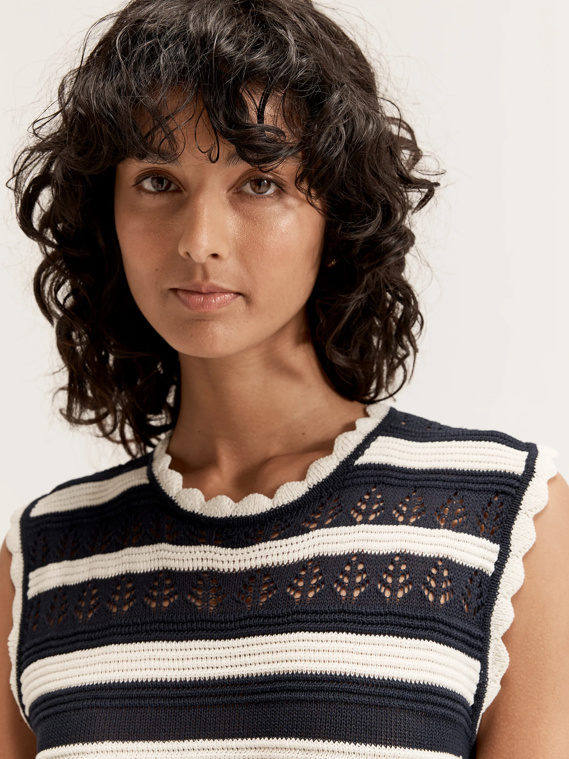 The Celeste Dress is crafted from a linen blend yarn and features delicate scallop detailing on the neckline, armholes, and hem. With a crew neckline and pointelle detailing on the upper bodice, this above-knee length dress showcases a chic navy and ivory stripe print, perfect for any occasion.