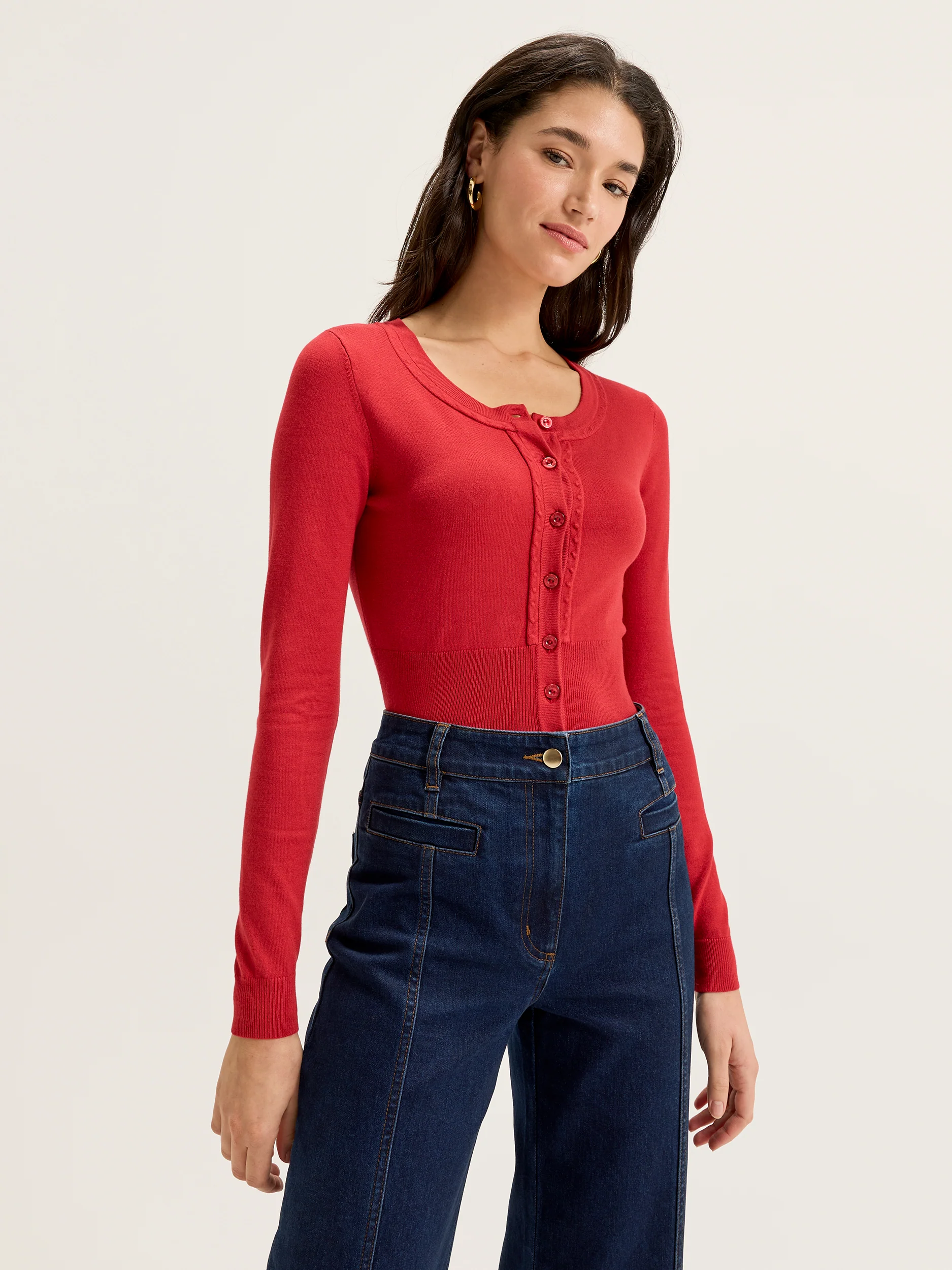 The cardi's you love are back! Our new range of planet-friendly EcoVero cardi's includes the timeless Chessie Long Sleeve Cardi in a ruby red shade. Crafted from fine gauge Ecovero fabric, this fully fashioned knit features long sleeves, a button-through design with Review buttons, and a cropped length as per the traditional Chessie style. Elevate your wardrobe with this elegant and sustainable cardi, perfect for pairing with our prom dresses or bottoms.