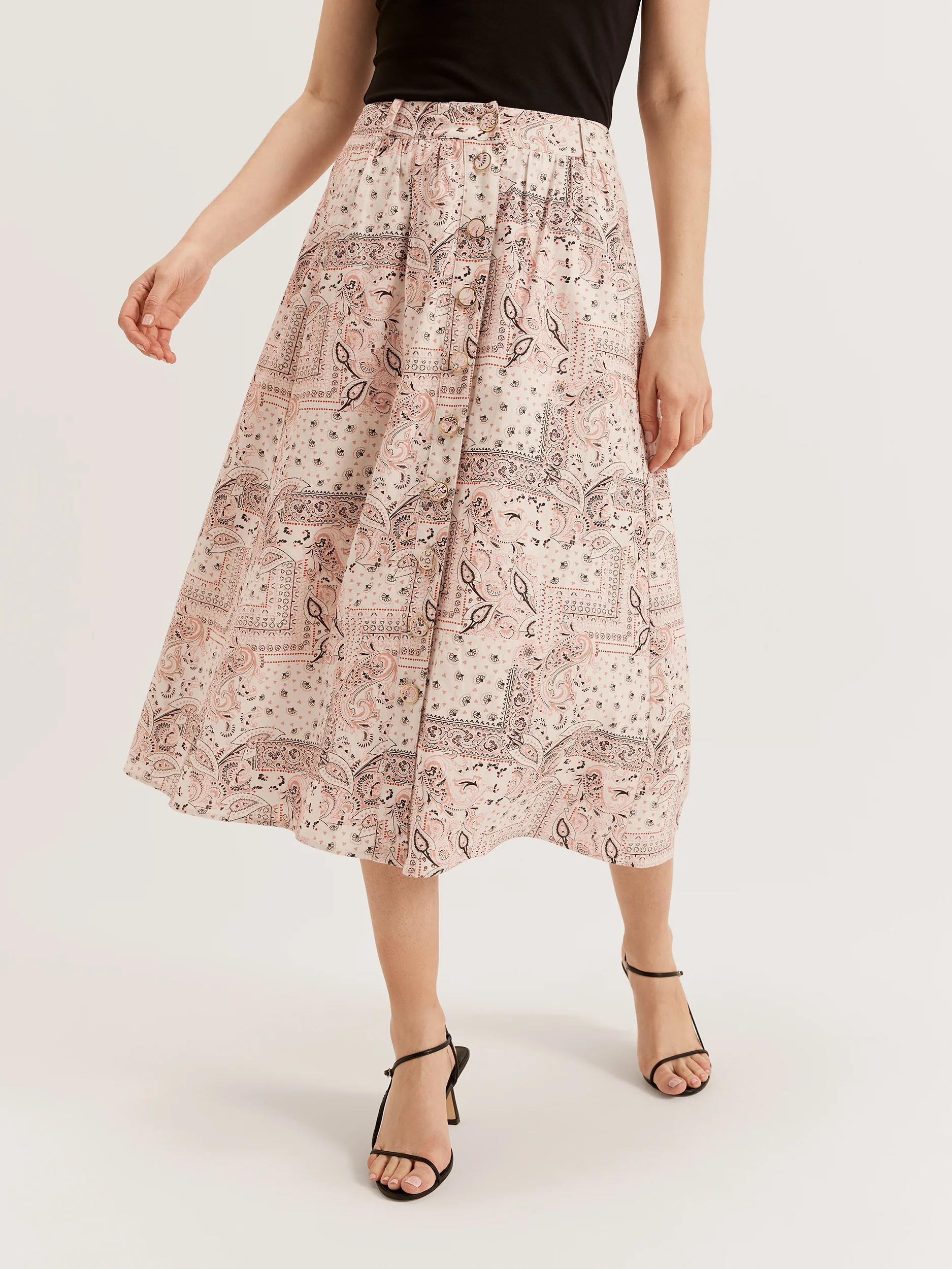 Stepford perfection! If you love a classic 1950s look with a modern Euro summer twist, add the Cypress Paisley Skirt to your cart while you can. This gorgeous vintage inspired skirt is made of a breezy and soft linen blend fabric with a below knee length and button through front. Fully lined with a waistband with belt loops, the Cypress Paisley Skirt also boasts self covered buttons with a soft gold ring detail. Available in our stunning paisley all over print, the Cypress Paisley Skirt will always be on-trend, whether you're dressing up for work or play.