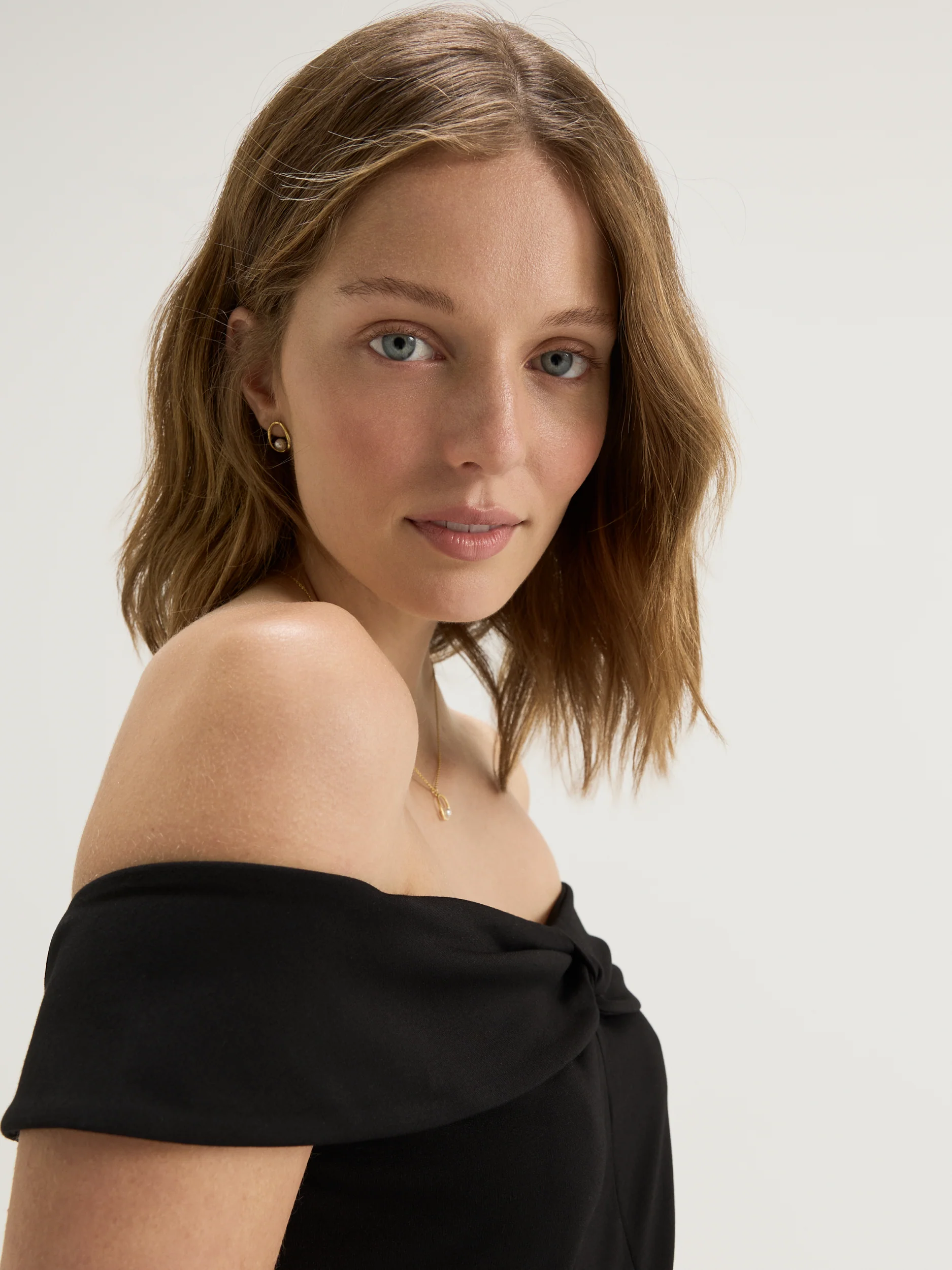 The Esther Top is a true statement piece with its off-shoulder neckline and twist front detail. Cut to a fitted silhouette, this top is made of our signature stretch ponte fabric and can be styled with your favourite statement skirts and tailored pants for a going out look, or pared back with simple denim.