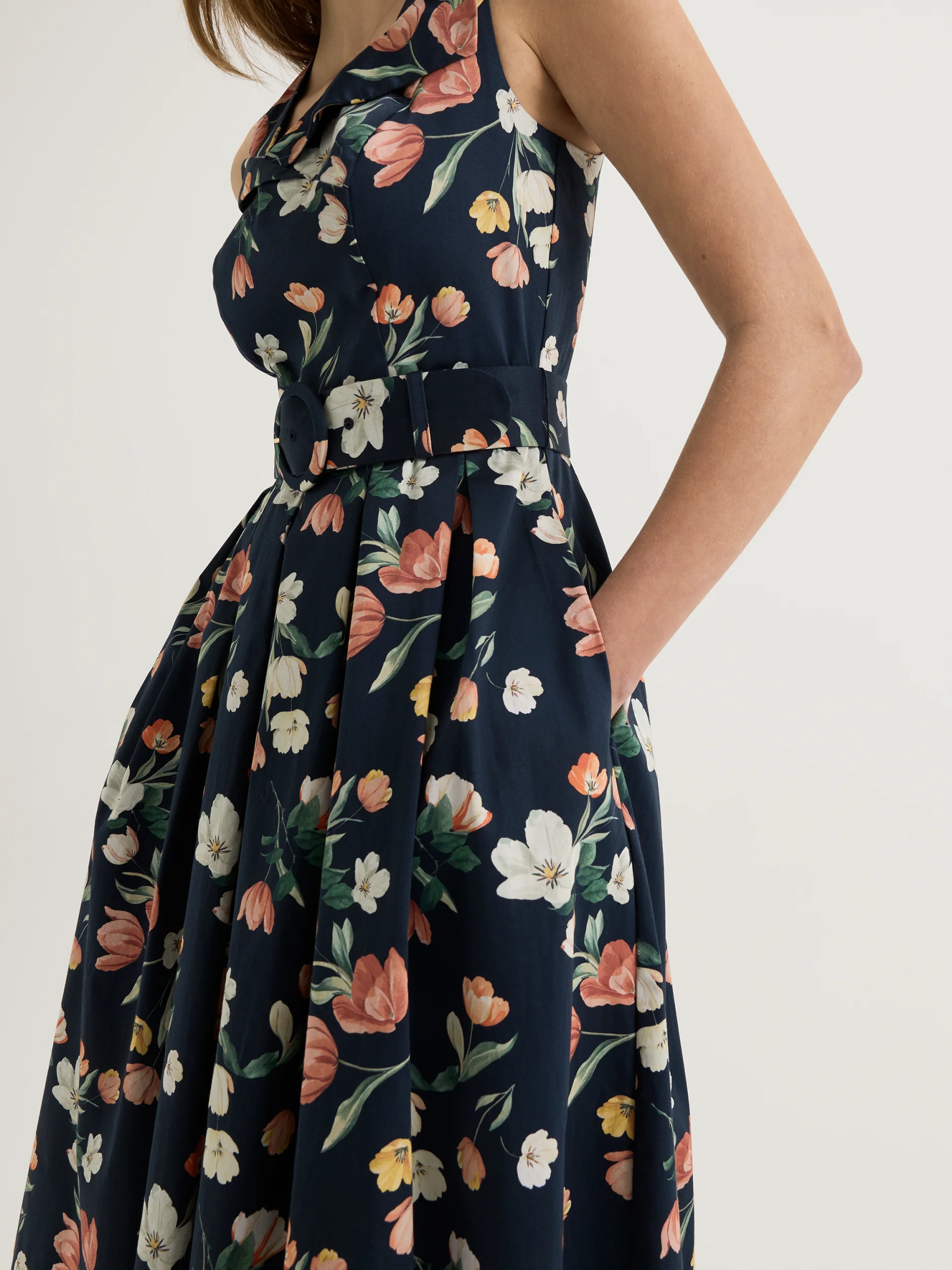 Made of a stretch cotton fabric that features this season’s statement print, the Gardenia Dress is a vintage inspired piece that features a Queen Anne neckline, fitted bodice, and full pleated skirt. Complete with a belted waist and side pockets for small essentials, this dress is ideal for day to night outfitting.