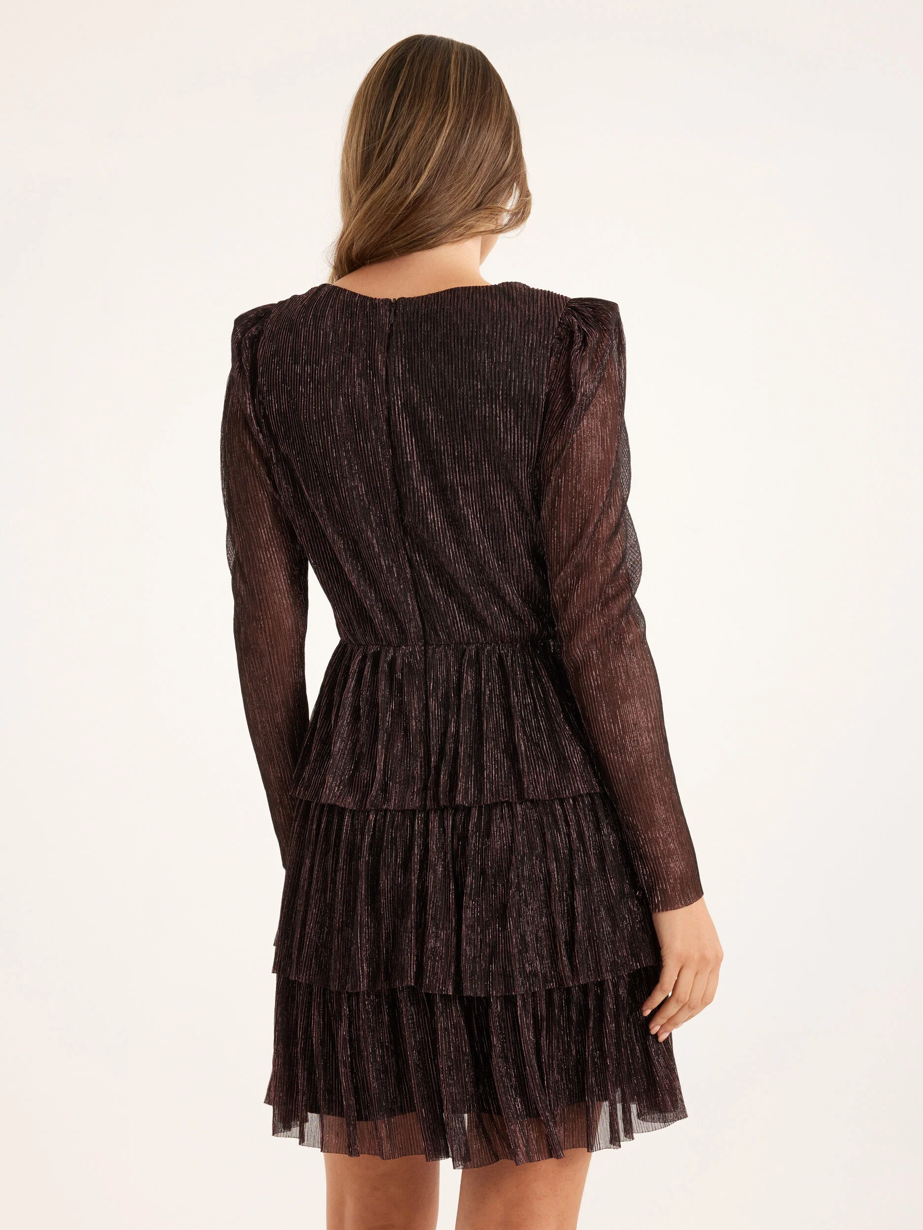 The Glitter Party Mini Dress is a bold statement style made of a lightweight glittered plisse fabric. With long sleeves and a ruffled skirt, this dress is perfect for cocktail parties and functions.