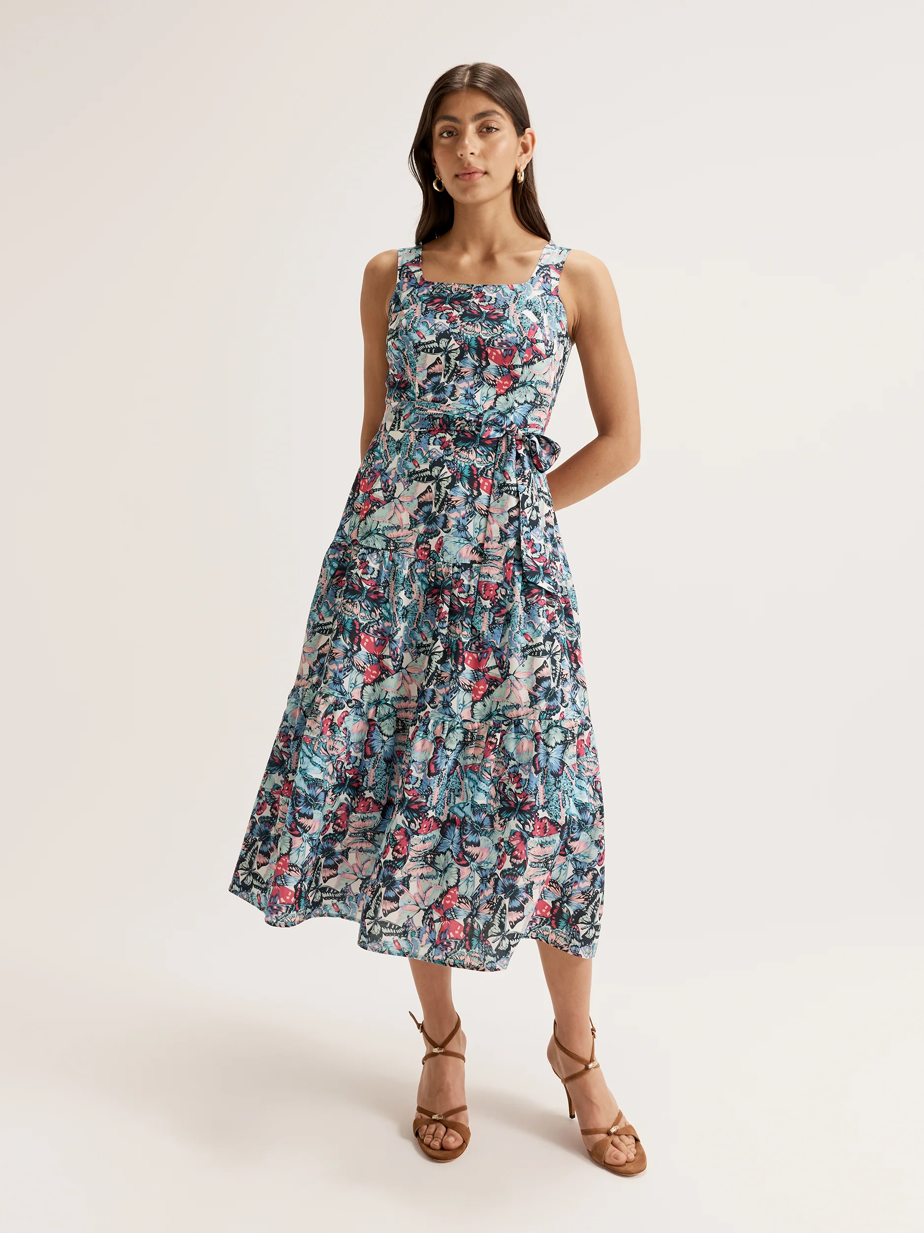 The ultimate fun in the sun outfit for this season, the Gossamer Dress is perfect for every occasion on your calendar. This beautiful midi dress features our newest and most exclusive print that we know you’re going to love! With a smattering of butterflies in shades of blue and pink, the Gossamer Dress is full of eye-catching detail. Made of a luxuriously soft fabric, the Gossamer Dress has a sleeveless fitted bodice with square neckline, a tiered skirt, and self-fabric tie belt. Secured with an invisible back zip and fully lined for comfort and breathability, this dress is a must-have for the warm weather ahead.
