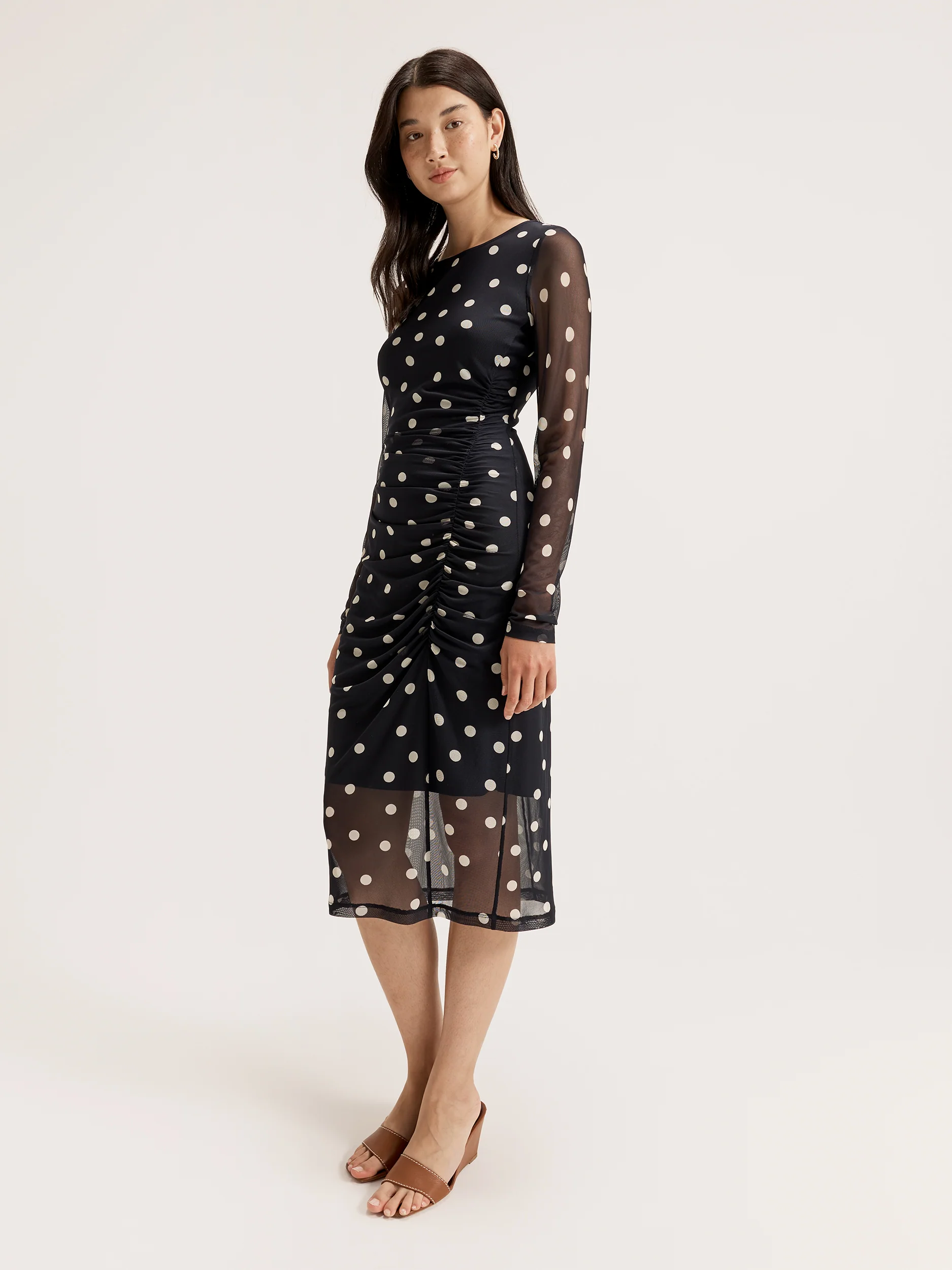 Soft, stretch, and super flattering, this dress is for the polka dot lovers who are looking for something a little new and a lot exciting. The Joy Spot Mesh Dress is a spot-lovers dream, with an all-over spot print on our newest fabric - a lightweight and luxuriously soft sheer mesh! Far from sacrificing all the details that make our dresses so flattering, the Joy Spot Mesh Dress still incorporates modest style details, like long sleeves, a midi length skirt, crew neckline, and full body lining. To help flaunt your figure, the Joy Spot Mesh Dress features soft ruching and gather details along the bodice. We absolutely love styling this dress with heels and a matching bag for a night out with the girls.