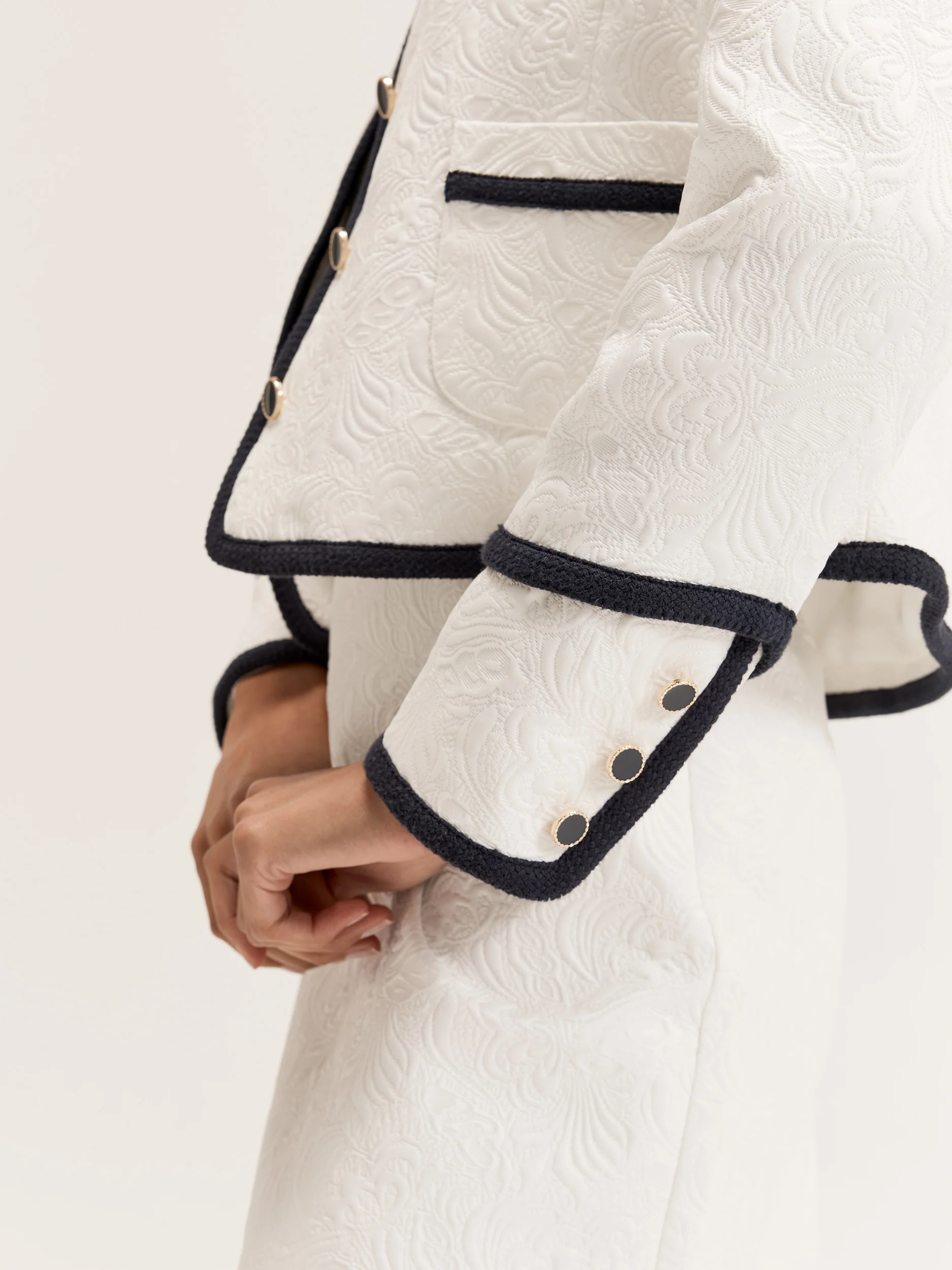 The Kaia Jacket features a matelassé jacquard fabric with a dimensional texture and a contrast braided trim on the neckline. With long sleeves, gold detailing, and a crew neck, it showcases elegant panelling and a cropped length. Fully lined with trimmed pockets, it pairs perfectly with the Kaia Skirt or dress.