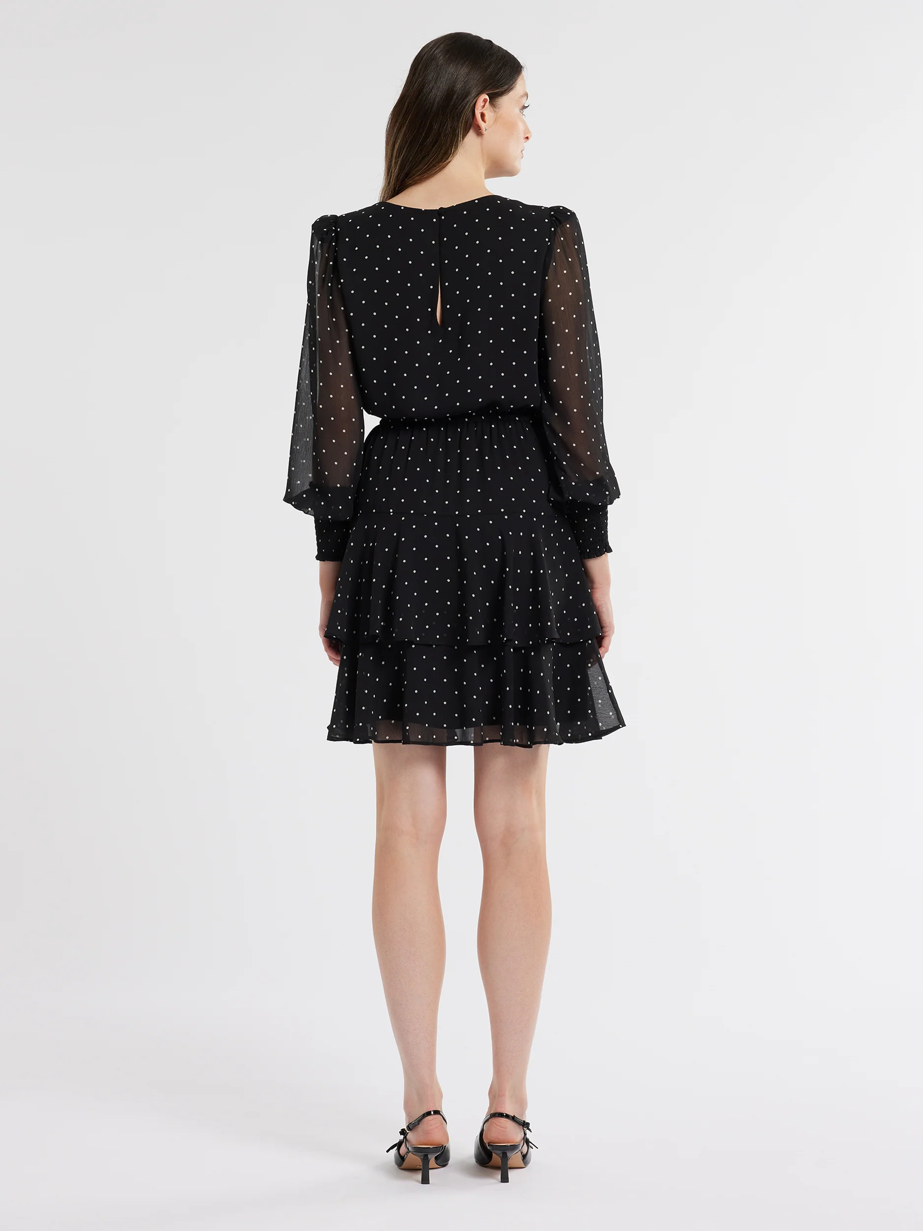 Dainty, feminine, and effortlessly stylish, the Kelly Spot Dress will be your go-to for dinners, date nights, and beyond this season. Made of a lightweight and floaty fabric, this gorgeous dress features a micro-spot print all over on a classic black base that is simultaneously playful and elegant. The Kelly Spot Dress is perfect for wearing across seasons, with its round neckline, long sheer puff sleeves, elastic waistline, and tiered mini length skirt with frill detailing. Pair with dark tights and heels in the winter then swap out for a strappy sandal as the weather warms - no matter what's on your agenda, this dress will have you looking and feeling your best.