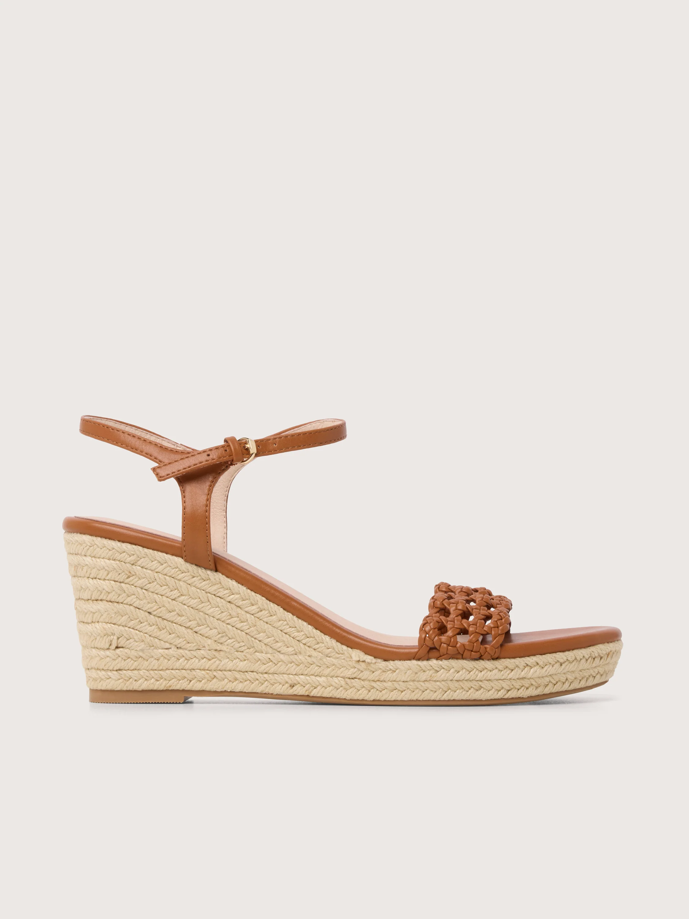 A perfect summer shoe, the Marjorelle Heel is made of quality vegan leather with a woven espadrille wedge heel. This shoe features an open toe design with hand woven toe strap and an adjustable ankle strap.