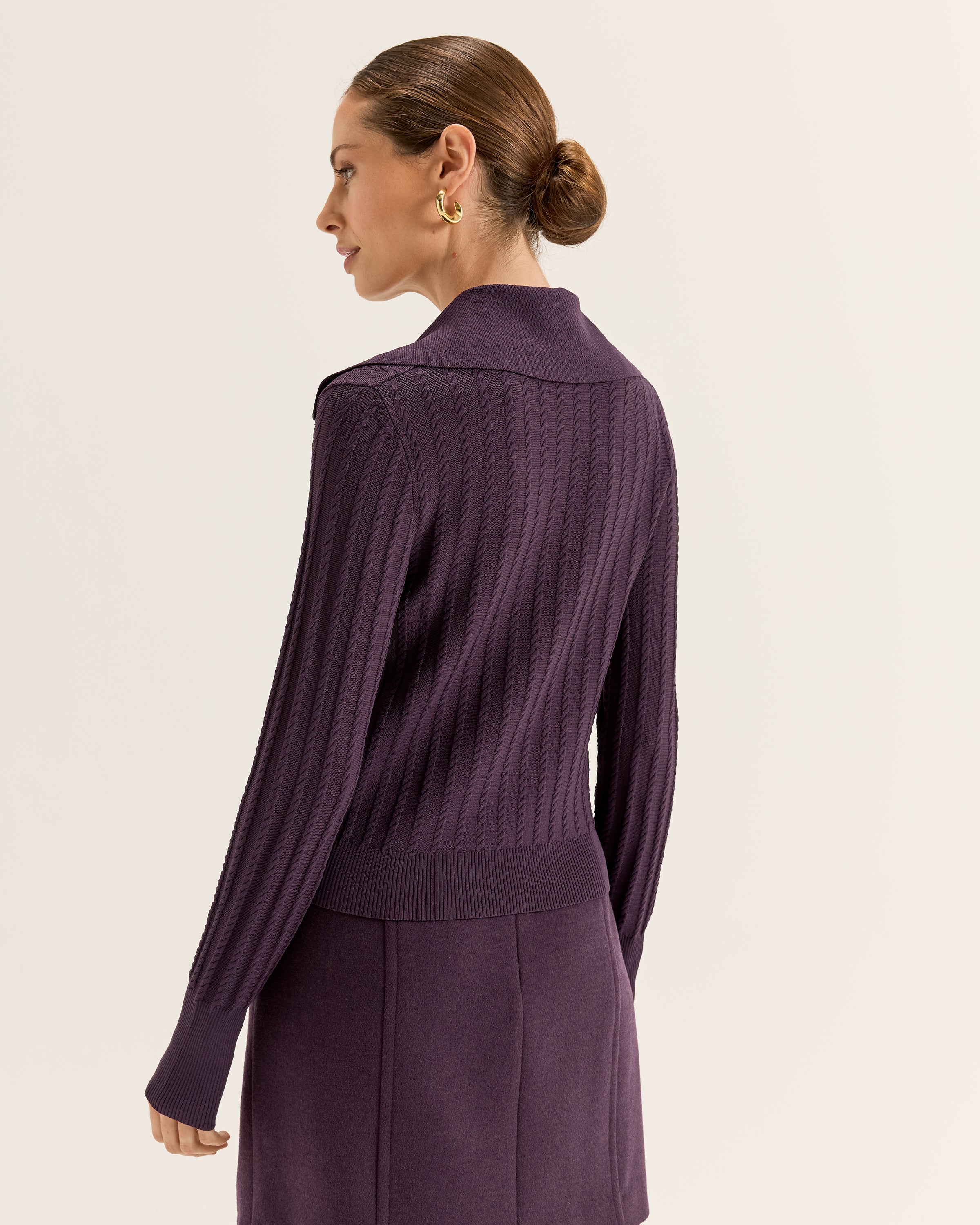 Elevate your new season knitwear with fresh new textures and silhouettes. The Novella Cardigan is the perfect throw-on-and-go style, made of a stretchy cable knit fabric. Cut to a hip length silhouette with collared neckline and long sleeves, the Novella Cardigan has a button through front with luxe gold rim faux pearl buttons for a chic and sophisticated touch. Layer over your favourite jeans for a relaxed outfit that doesn’t sacrifice style.