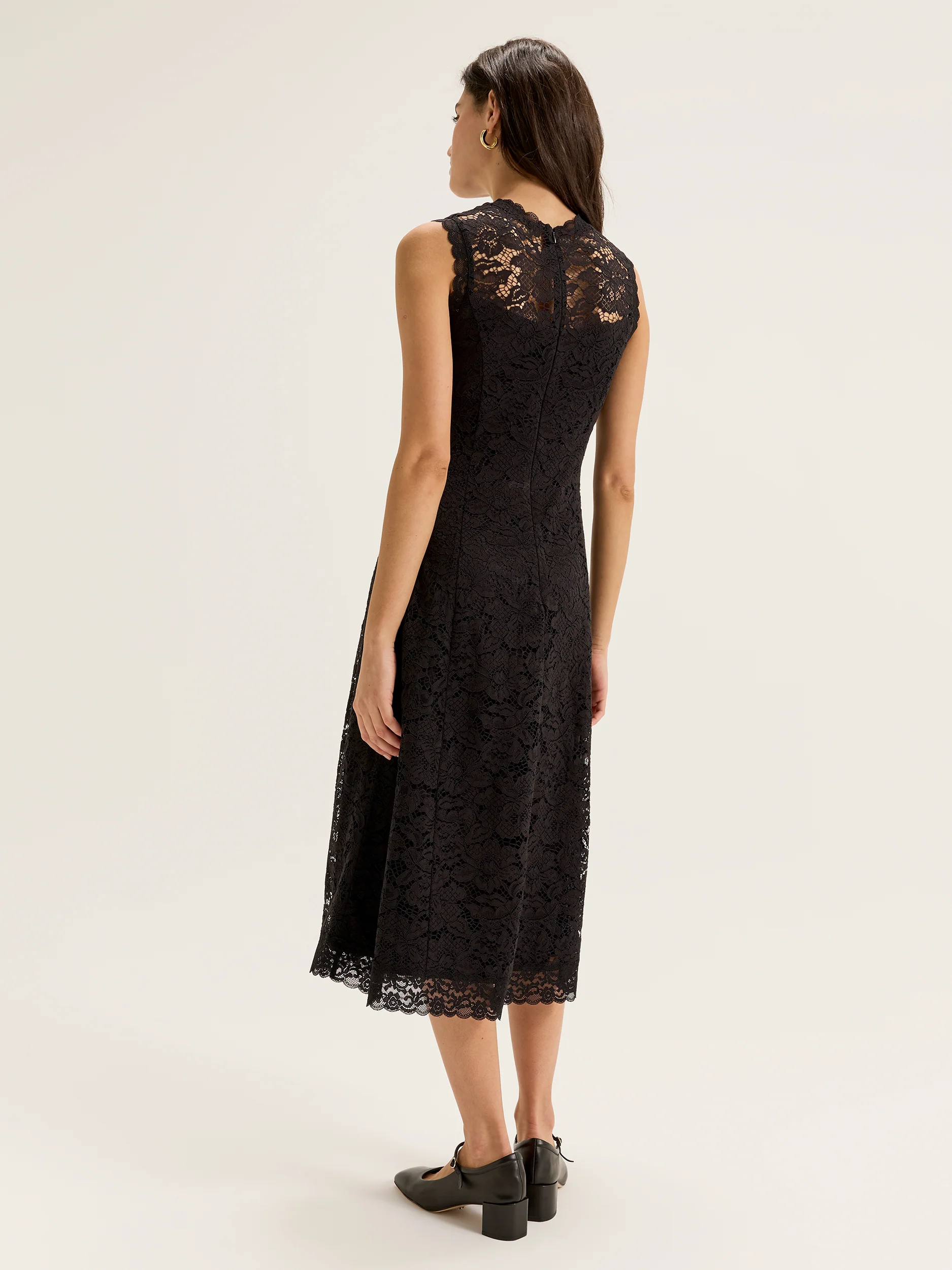 The Odile Lace Dress exudes elegance with a crew neckline and sheer yoke, complemented by lace trim at the neck, armholes, and hem. Fully lined through the body, this midi-length dress in a classic black shade features a center back zip, offering sophistication with a touch of allure.