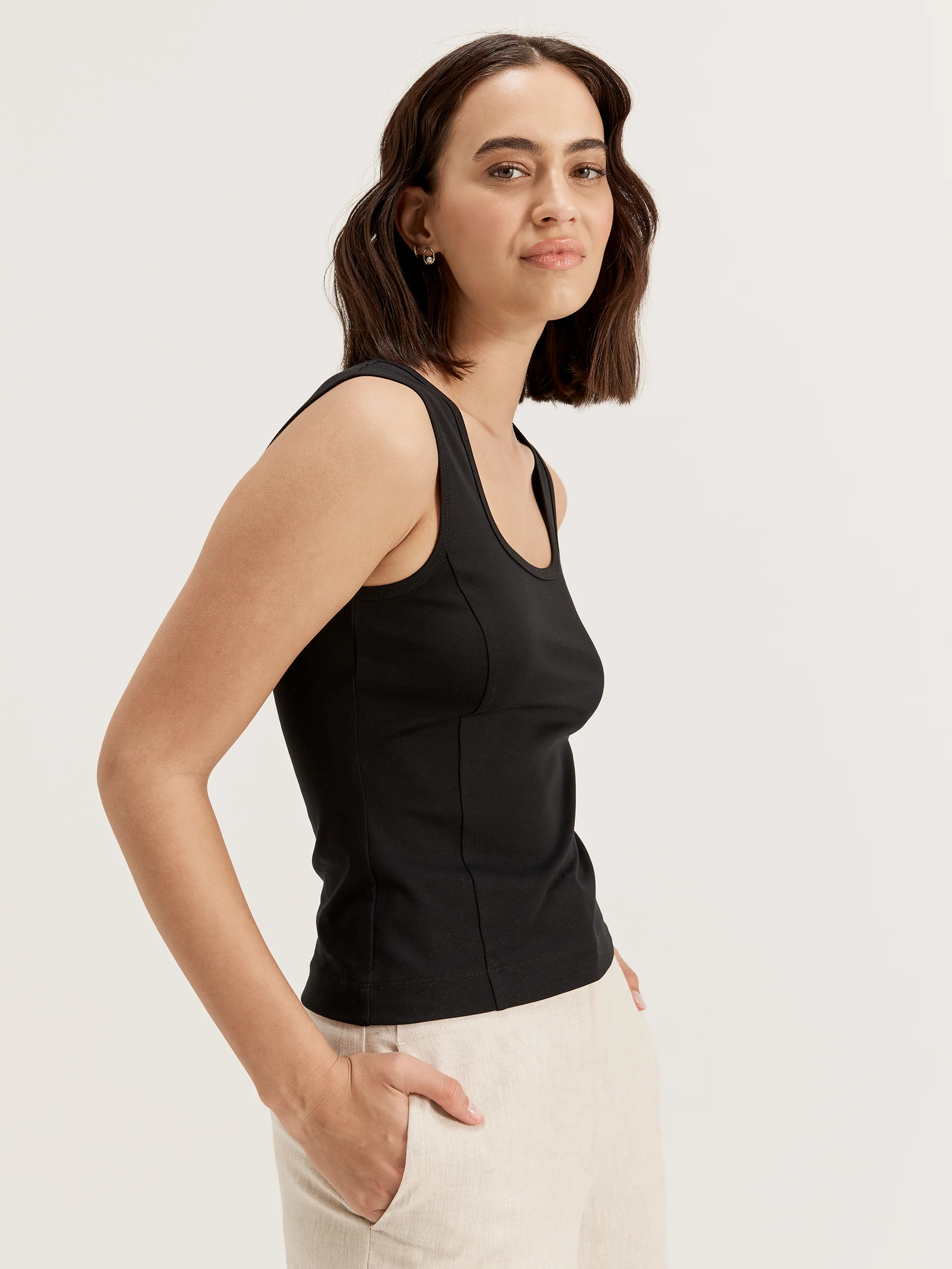 A good quality basic can not go overlooked. Our new Salsa Tank is the perfect addition to your transitional wardrobe, helping bridge the gap between spring and summer with ease and style. Made from our signature stretch ponte fabric, the Salsa Tank is a sleek take on an otherwise simple design, with panel detailing in the bodice, a square neckline, and wide shoulder straps. Whether you’re putting together a simple outfit for work or keeping it casual, the Salsa Tank is equal parts comfortable and stylish, elevating your looks effortlessly.