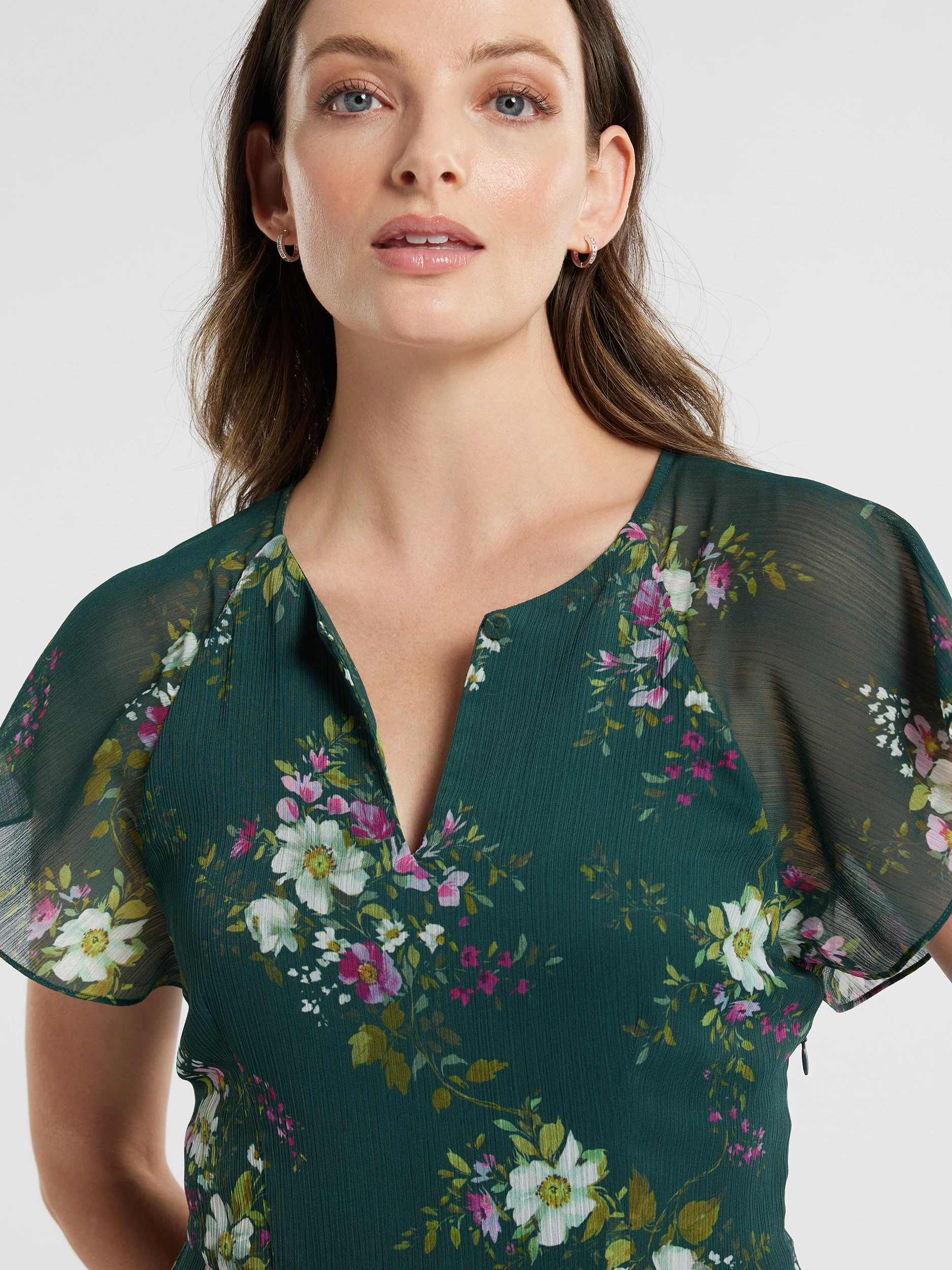Immerse yourself in botanical beauty with the Woodland Bloom Midi Dress. Crafted from crinkle georgette, it features flutter sleeves and a tiered skirt, adorned with button and loop detailing. Fully lined for comfort, it's finished with an invisible zip and boasts a mesmerizing hunter green hue with purple and ivory floral motifs.